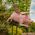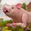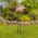 Perched atop the stake is a large potbelly pig, with his legs outstretched, he rocks as if flying through the air with his kinetic wings flapping in the breeze.